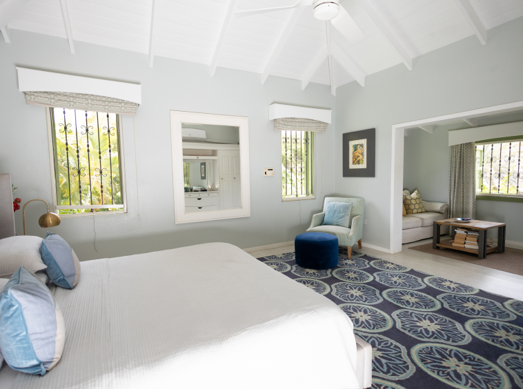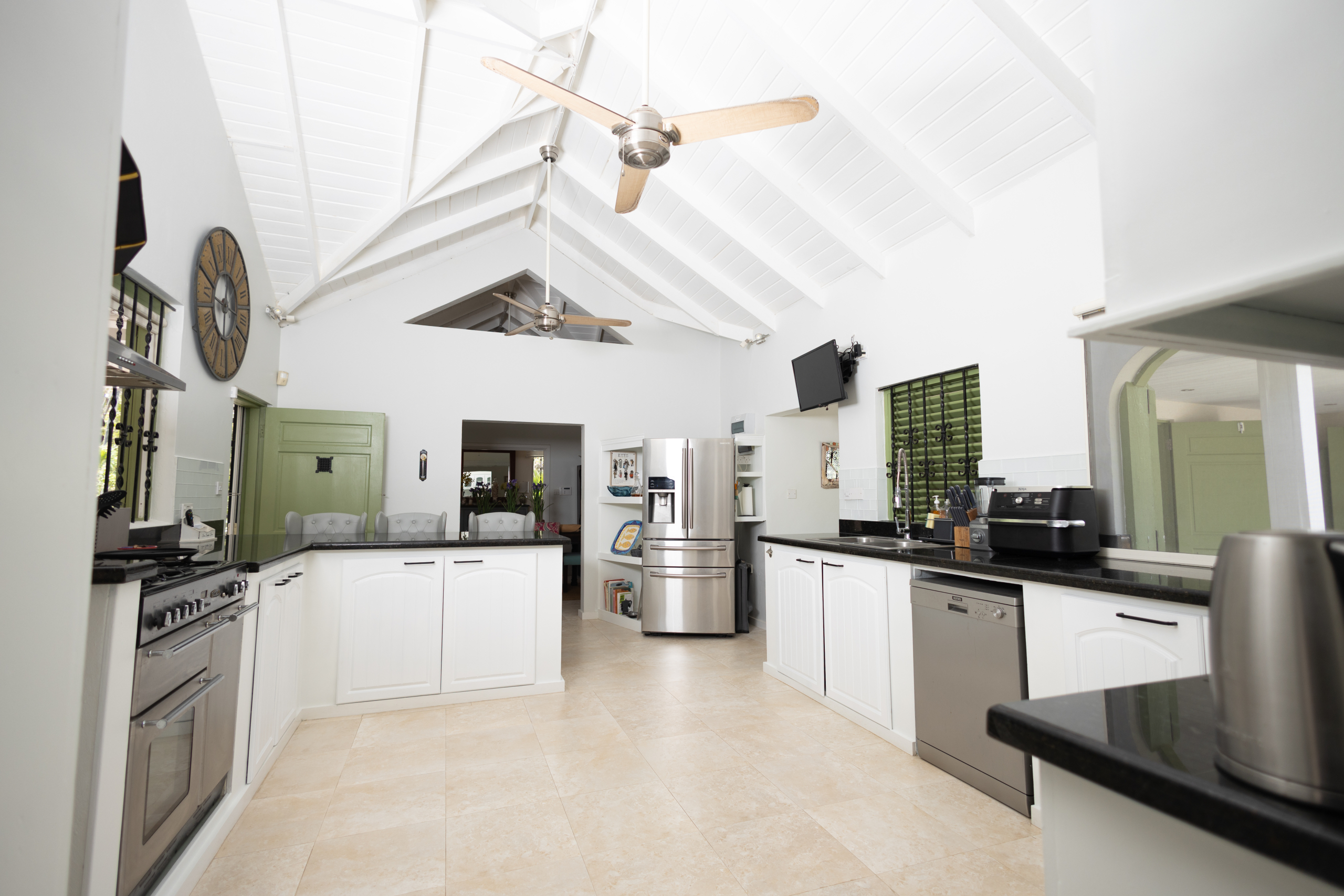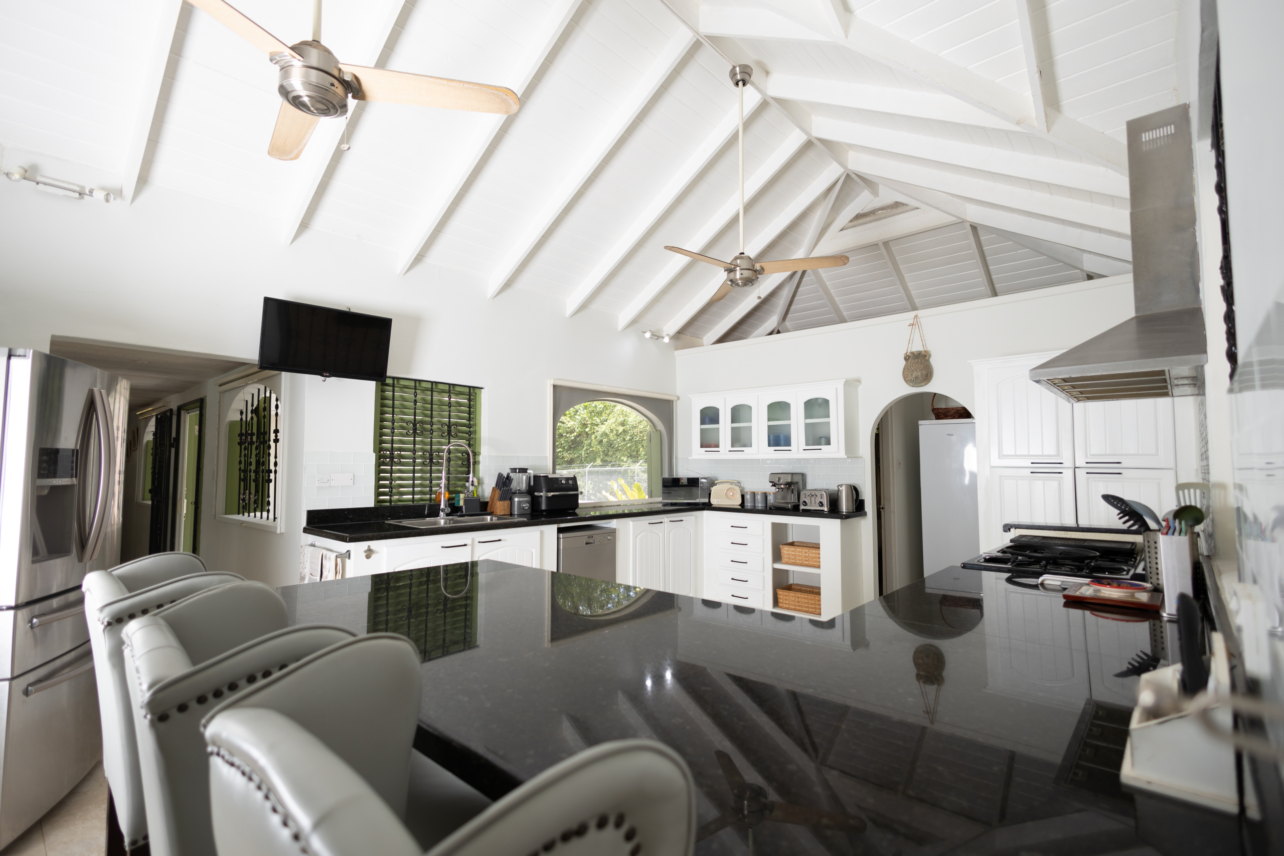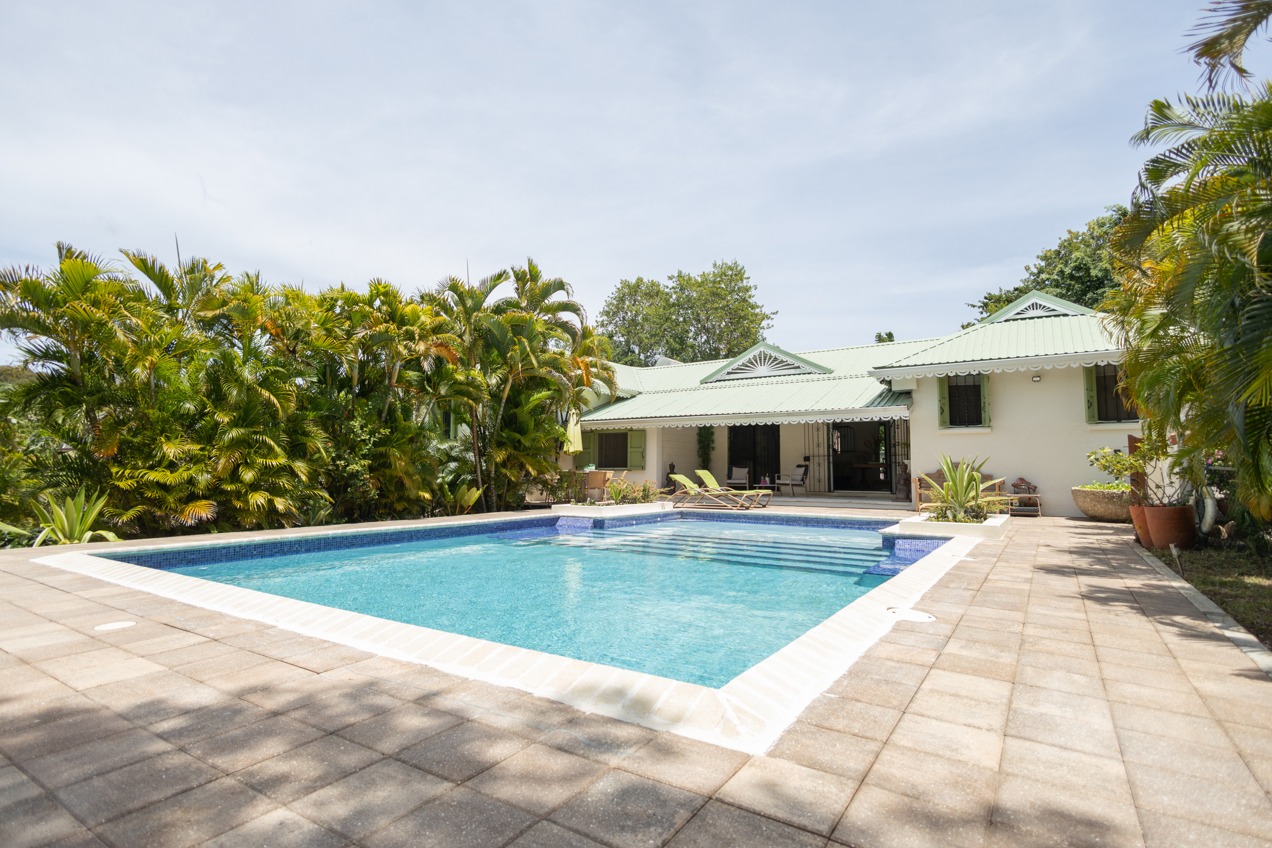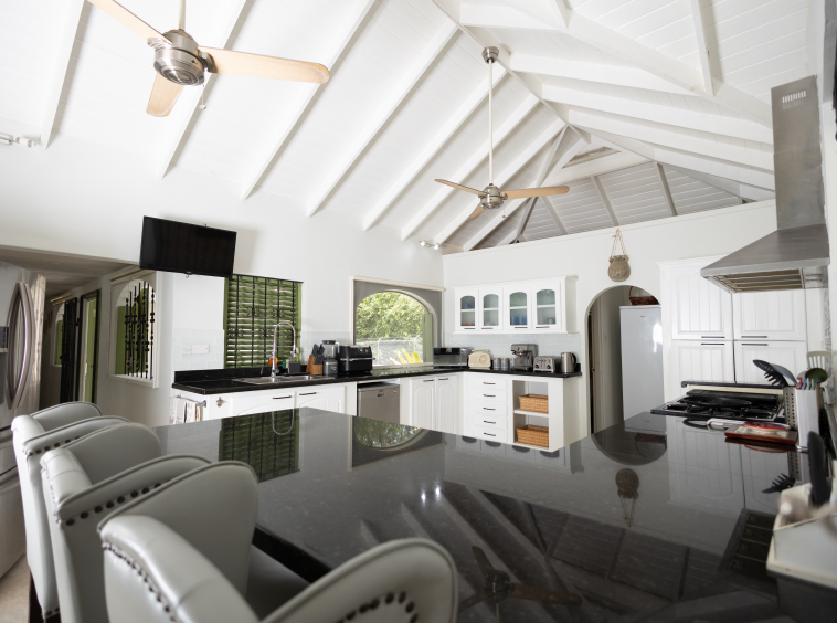 Crafted with elegant simplicity and designed to capture the island’s natural airflow, the villa’s open-concept living spaces are bathed in light and framed by soft breezes channeled through the surrounding valleys. The modern gourmet kitchen is adorned with granite countertops, a central island, and contemporary cabinetry — seamlessly connecting to the indoor dining and lounge areas and spilling out to the inviting outdoor pool deck, ideal for entertaining or private relaxation.