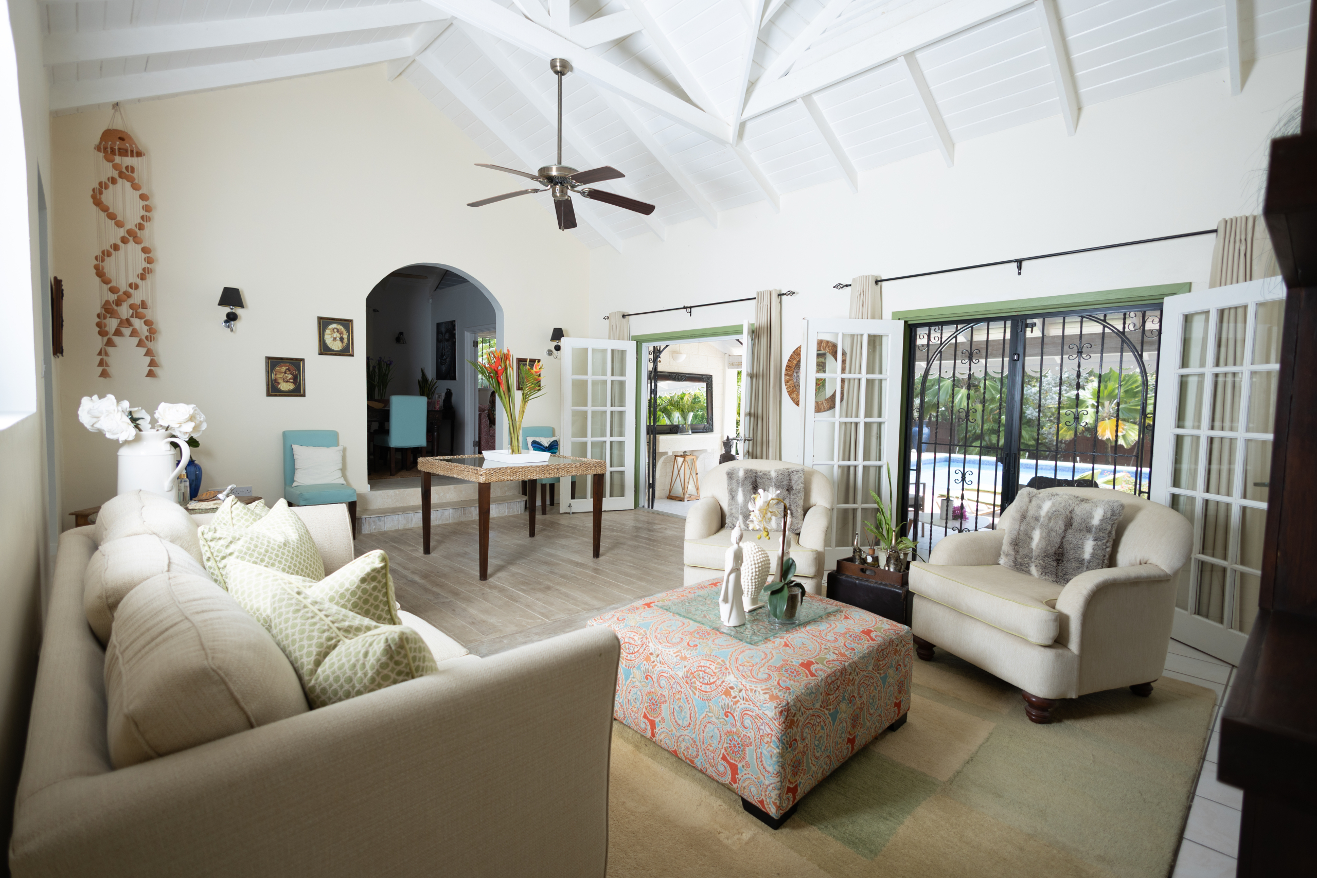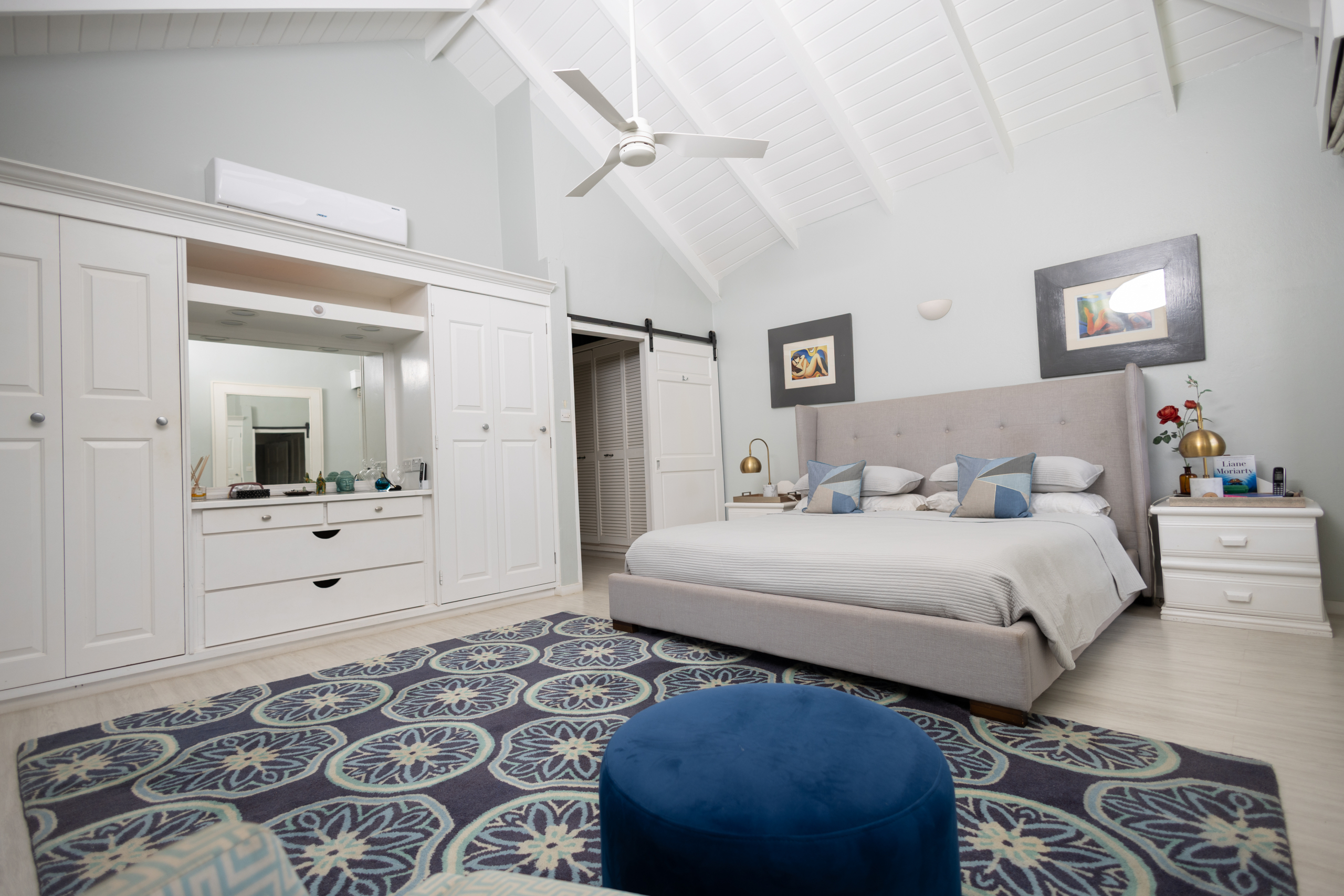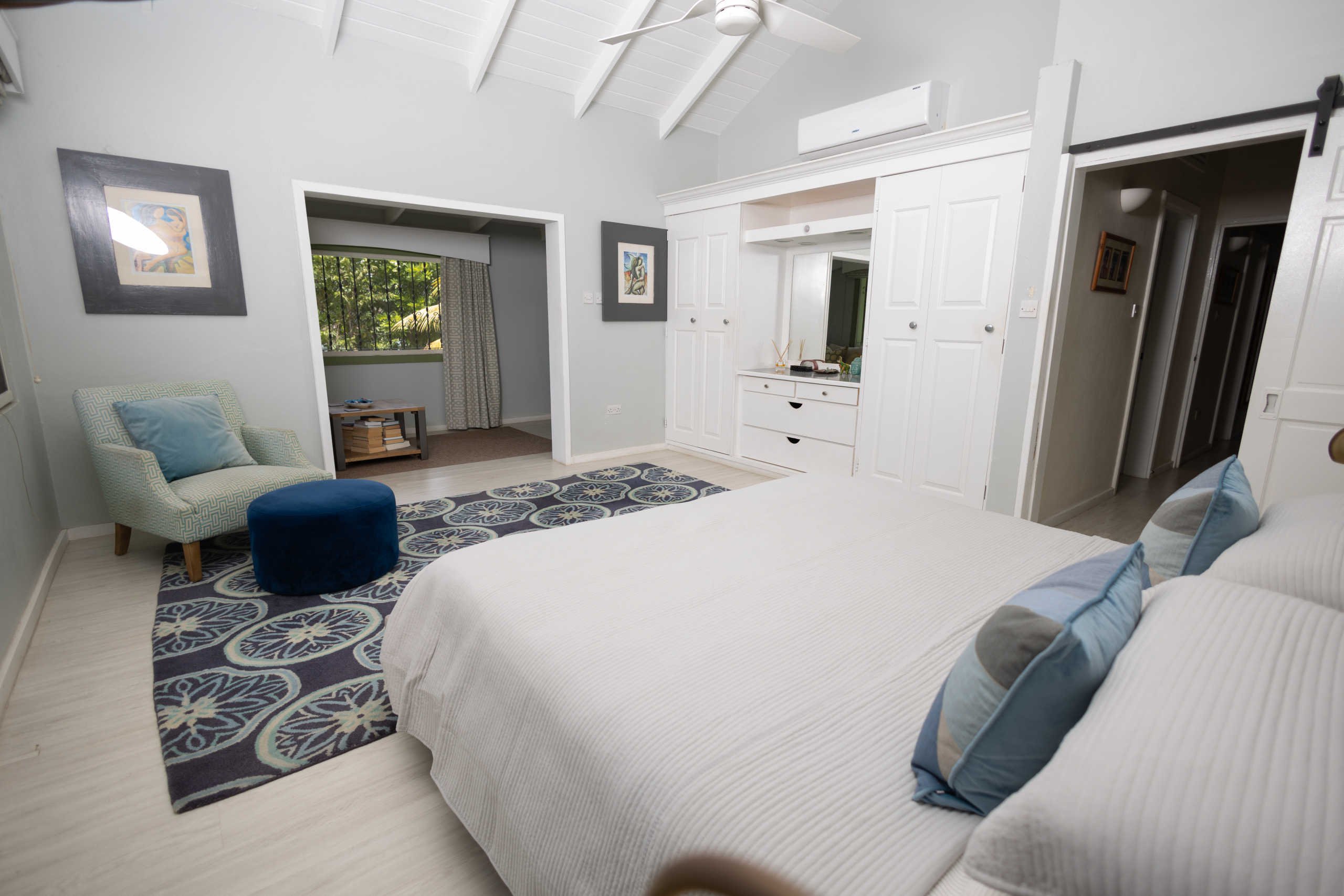 The villa’s five principal bedrooms are spacious and refined, with two offering dedicated seating areas for added luxury. One bedroom has been thoughtfully transformed into a private office and home gym, reflecting a lifestyle of both productivity and wellness. Easily reverted, it provides flexibility for future owners. The home is further enhanced with built-in cabinetry, ceiling fans throughout, and meticulous attention to flow and function.