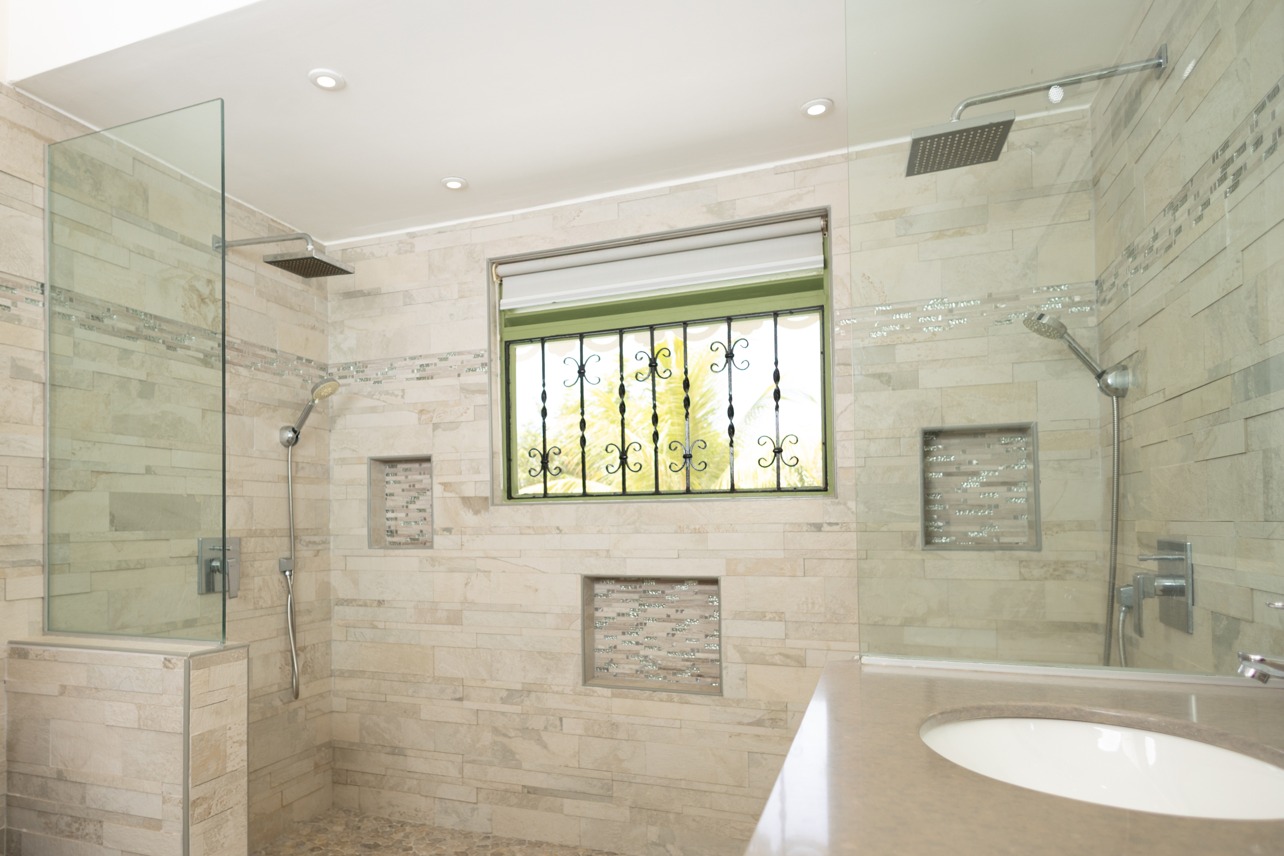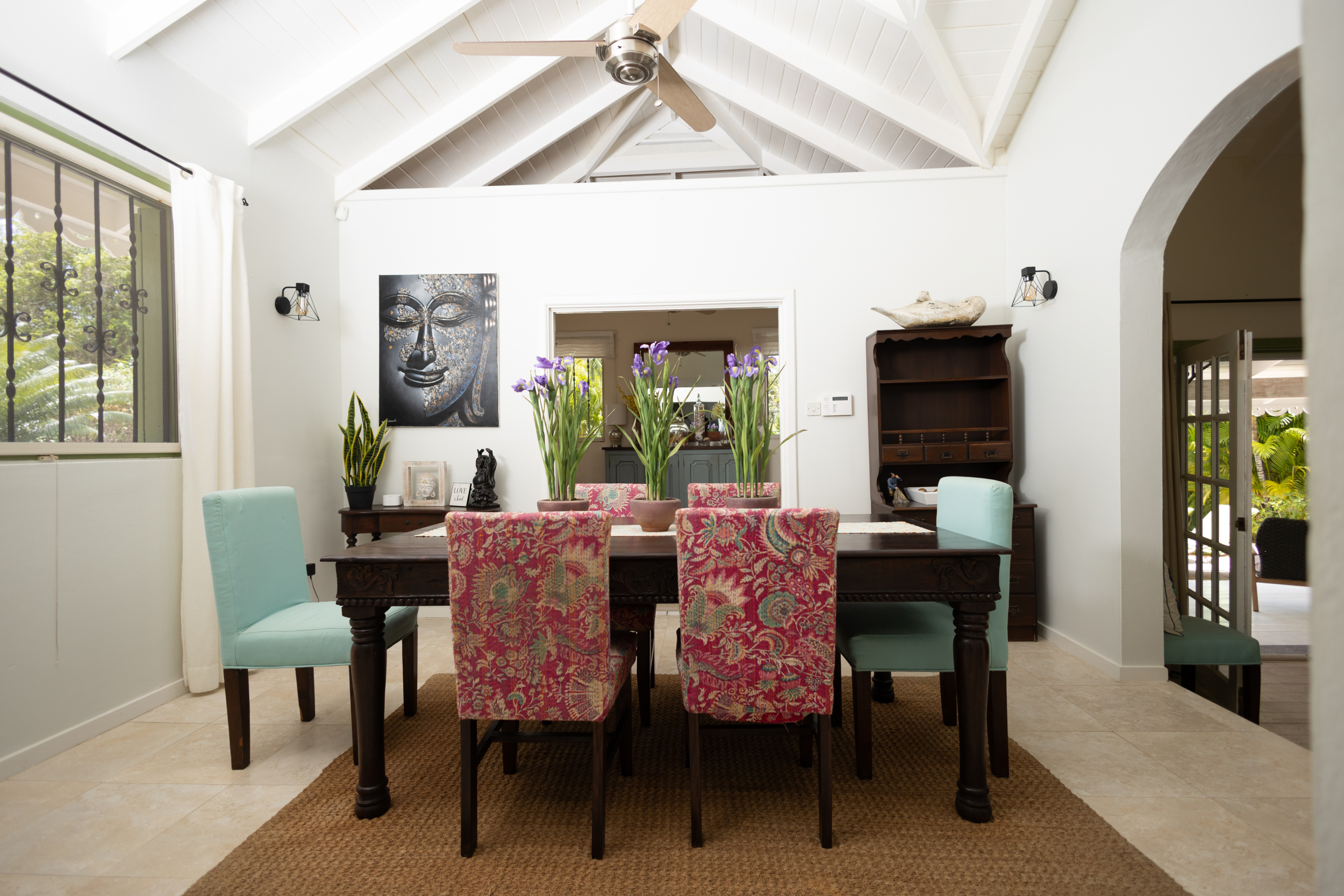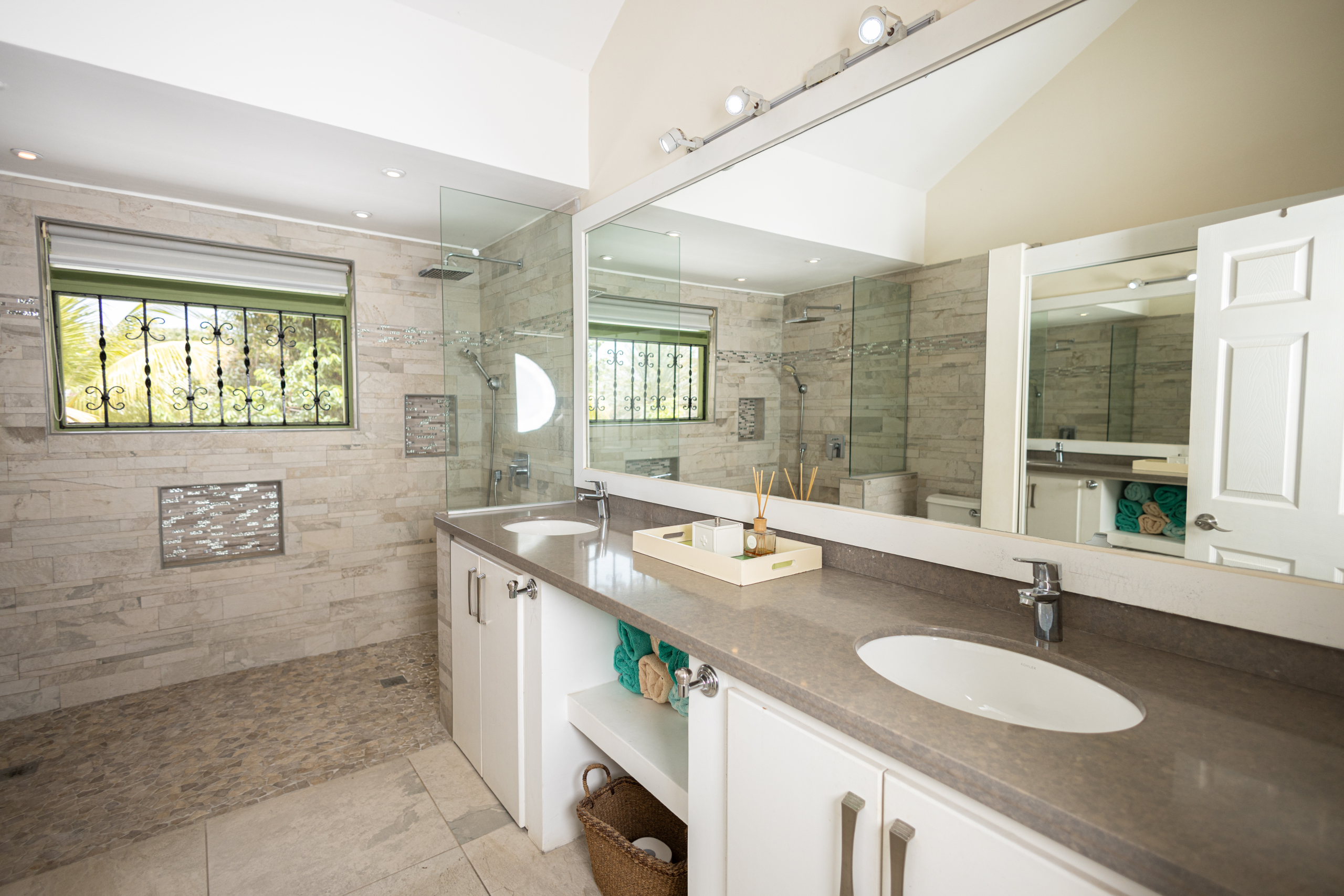 The villa’s five principal bedrooms are spacious and refined, with two offering dedicated seating areas for added luxury. One bedroom has been thoughtfully transformed into a private office and home gym, reflecting a lifestyle of both productivity and wellness. Easily reverted, it provides flexibility for future owners. The home is further enhanced with built-in cabinetry, ceiling fans throughout, and meticulous attention to flow and function.